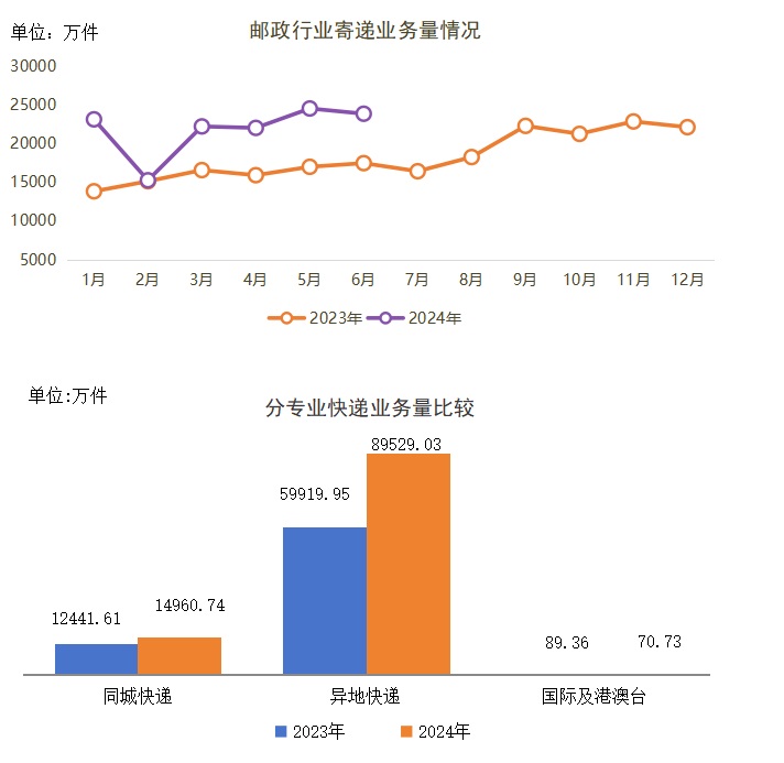 6月份,邮政行业寄递业务量完成23908.91万件,同比增长36.58%。其中,快递业务量完成19415.59万件,同比增长44.52%。